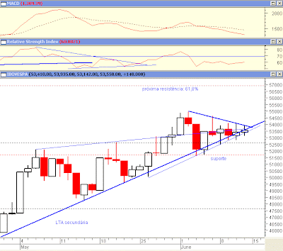 Os indicadores continuam fracos. O Ibovespa está numa congestão (triângulo). Contudo, a LTA não foi perdida. Está é uma situação onde o melhor é não fazer nada. Venda se a LTA for perdida. Compra, se o triângulo for rompido, mesmo assim, sabendo que em 57 mil pontos está uma resistência difícil de ser superada.