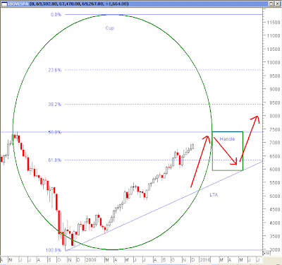 Existe um fato: o Ibovespa está mantendo a tendência de alta, apesar dos triângulos, das resistências e de outras figuras baixistas. Porém, o principal é a tendência. Mesmo com a crise em Dubai, algo inesperado, a tendência se manteve. Qual o limite? O TH, de 73.920 pontos, é uma resistência formidável e, não tendo a economia retomado aos níveis de maio de 2008, pode indicar uma sobrevalorização (apesar de muitos papeis estarem longe de seus respectivos TH, como Vale, Petro, siderúrgicas, etc).